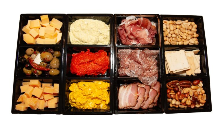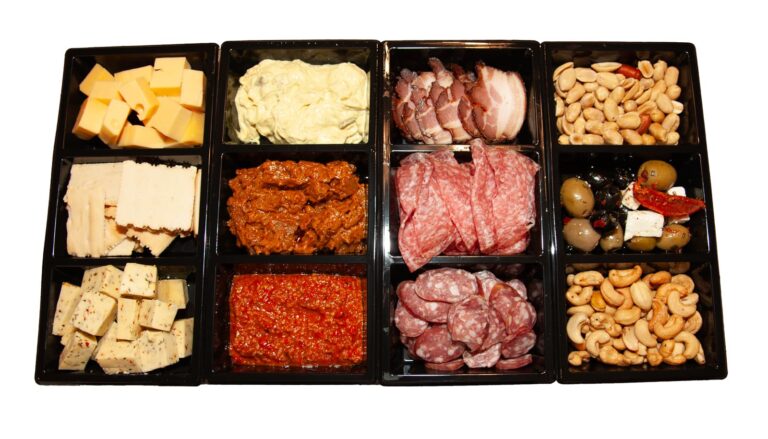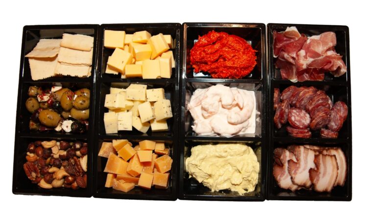 Jong belegen kaas, Toastje, Cashewnoten, Italiaanse kruiden kaas, Droge worst, Kipkerrie salade, Kipsaté salade, Muhamara, Olijvenmix, Salami en grill spek